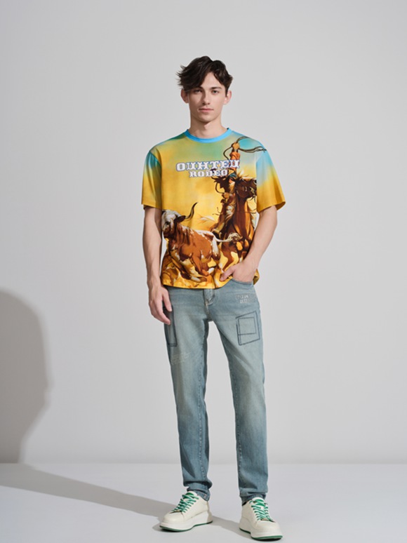 時髦張揚的西部牛仔風短袖,塑造叢林感。不落俗套的原創(chuàng)圖案,以和諧色彩搭配透露前衛(wèi)與個性