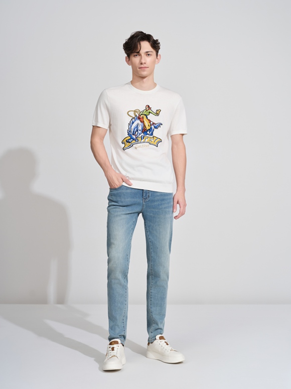 以精梳棉質(zhì)重塑活力邊界,剪裁利落貼合身形,釋放都市精英的從容氣場。淺色水洗丹寧褲以恰到好處的垂墜感平衡視覺重心,從通勤會議到周末社交,游刃有余,自信而優(yōu)雅。