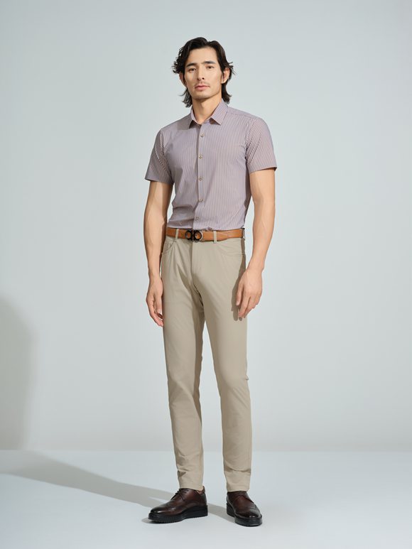 柔和豎紋襯衫,勾勒優(yōu)雅線條;淺色長褲修身垂墜,棕色皮帶點睛細節(jié);深色皮鞋沉穩(wěn)收束。簡約不失格調(diào),詮釋現(xiàn)代紳士的從容與品味。