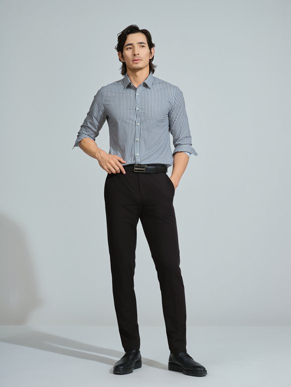 豎紋襯衫以深淺交錯的韻律,演繹都市精英的精致格調(diào)。簡潔的線條勾勒出挺拔身形,黑色長褲以利落剪裁收束整體輪廓,搭配經(jīng)典黑皮鞋,提升正式感卻不失時尚氣息。