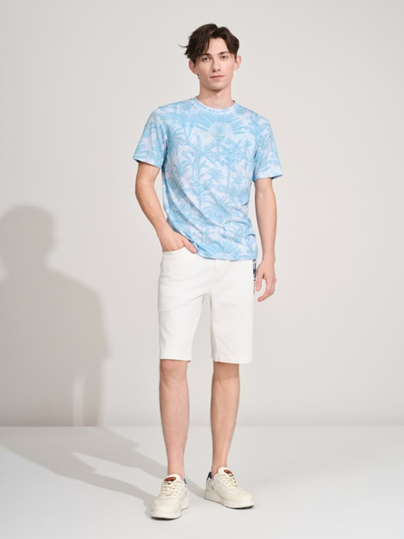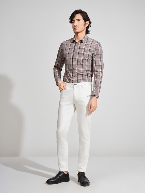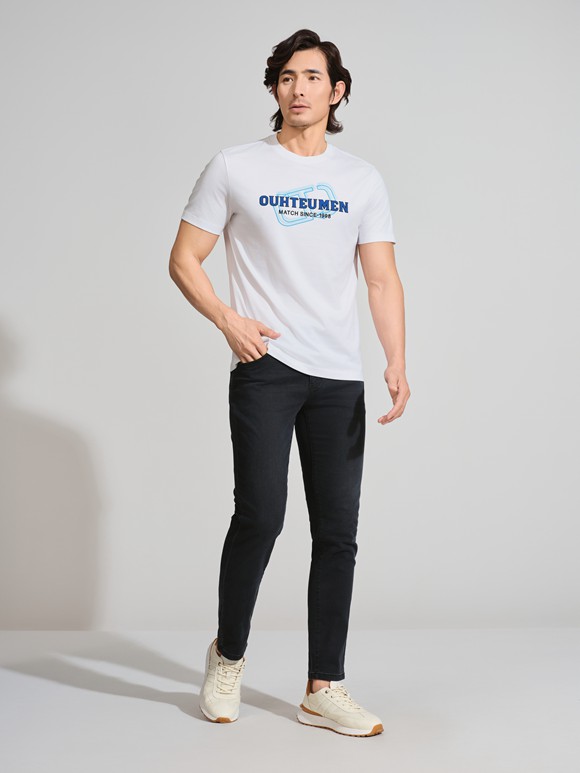 白色T恤以精致圖案點綴,清新自然;深色牛仔褲剪裁利落,勾勒修長線條;棕色皮鞋質(zhì)感沉穩(wěn),映襯整體造型。日常通勤或休閑出行,詮釋現(xiàn)代都市男性的從容與品位。